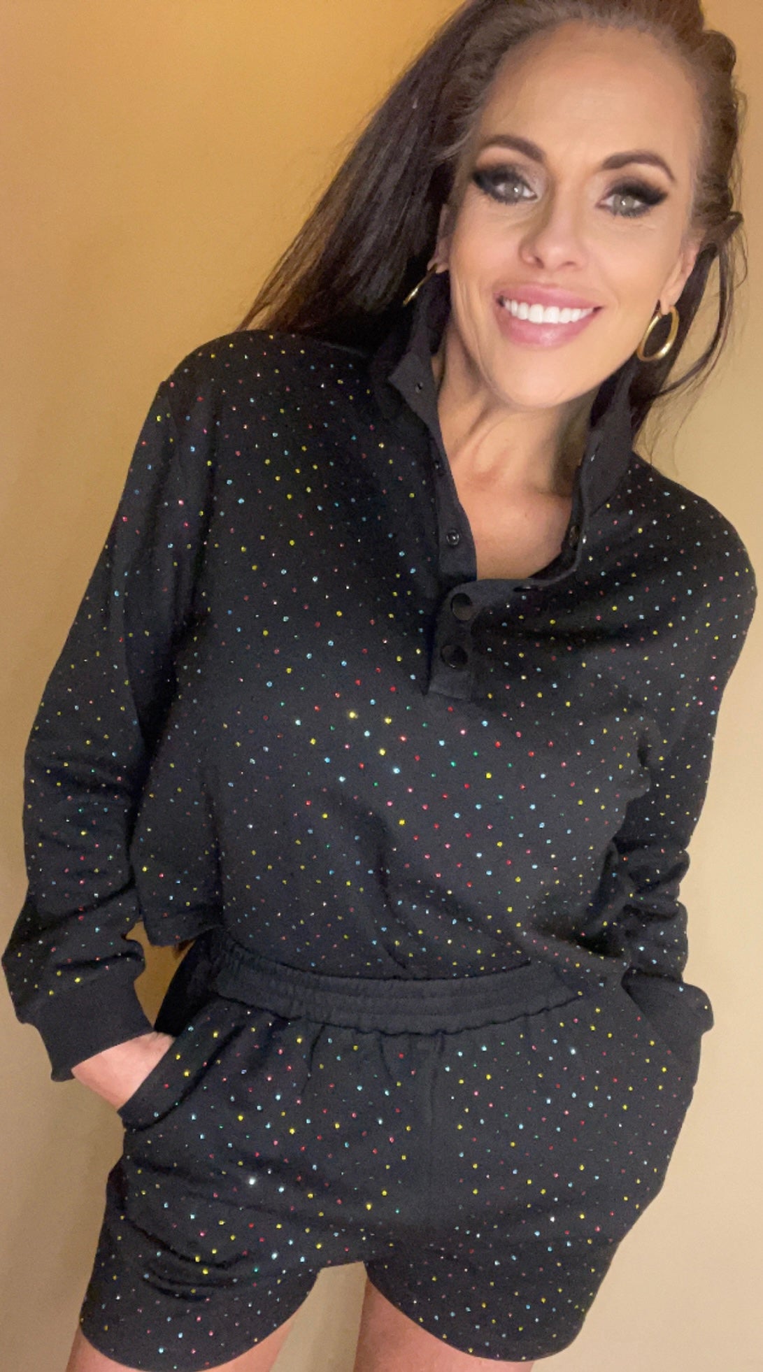 True to size. Turn heads with our Shimmering Colorful Rhinestone Set! This sleek black ensemble is adorned with vibrant rhinestones that catch the light beautifully, adding a dazzling touch to your outfit for any occasion.